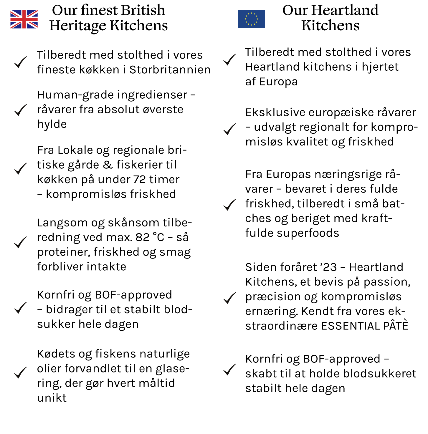 Hos ESSENTIAL FOODS tilbyder vi vores måltider tilberedt i to forskellige køkkener: vores traditionelle britiske køkken og vores europæiske køkken. Derfor kan du selv vælge dit køkken når du bestiller dit ESSENTIALS-måltid.